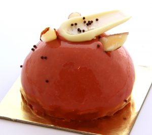These gateaux have a delicate lady-finger base layered with salted caramel mousse and melt-in-your-mouth mango custard. Finished with slice almonds and a mini white chocolate shard. It’s summery but has a level of luxury with that smooth delicious mango custard.
