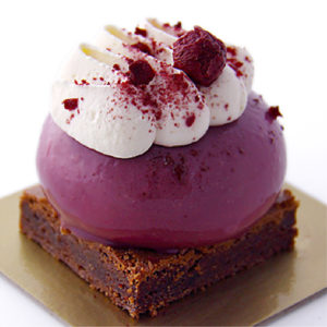 These gateaux have a homemade brownie based topped with a dome of fruity blueberry mousse. In the centre of the dome, you’ll find a cherry and blueberry jelly. Topped with whipped cream and crushed freeze-dried cherry. A perfectly balanced chocolate and fresh fruit flavour.