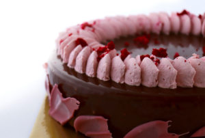A classic homemade Dacquoise sponge base, layered with creamy chocolate mousse and raspberry jelly made from fresh raspberries. Topped with Raspberry mousse and finished with freeze-dried raspberry pieces.